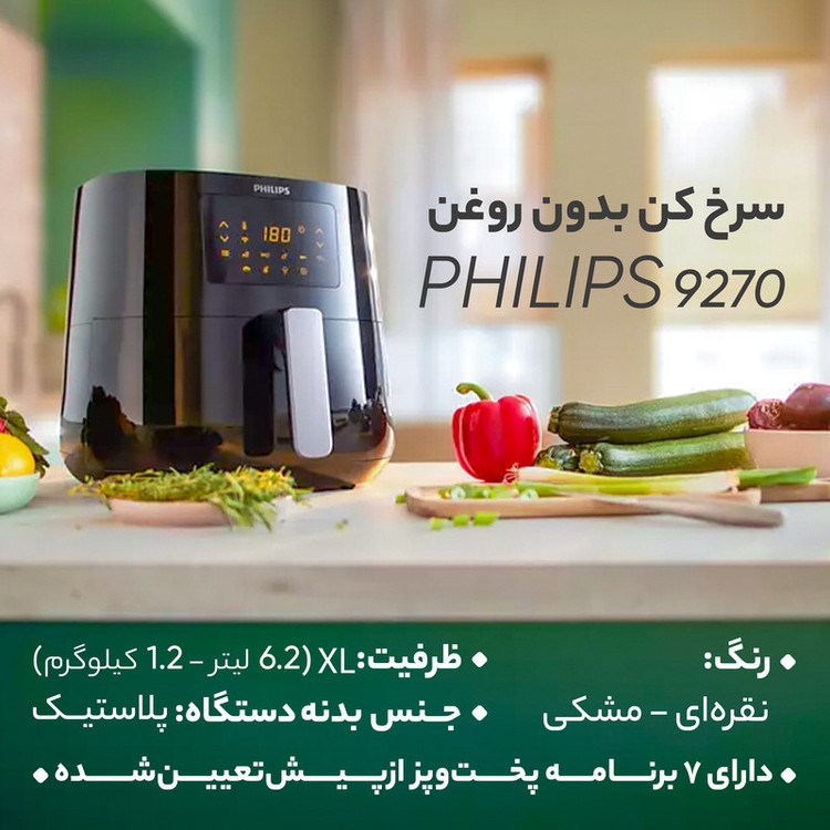 سرخ کن مدل HD9270 یکی از برترین و کم چربترین سرخ کن جهان میباشد. سرخ کنها از وسایل کار راه انداز و کاربردی است اما به دلیل مصرف خیلی زیاد روغن و نداشتن صرفه اقتصادی باعث شده که کمتر مورد استفاده قرار بگیرد. سرخ کن HD9270 فیلیپس این مشکل را حل کرده است. شما با استفاده از این سرخ کن تنها با چند قاشق روغن و در حدود 90 درصد چربی کمتر می توانید انواع غذاها را برای خود آماده کنید سرخ کن فیلیپس مدل HD9270 سرخ کنی سالم با فناوری Rapid Air فناوری هوای سریع یا Rapid Air با طراحی منحصر به فرد به شکل ستاره دریایی خود هوای گرم را می چرخاند و غذاهای خوشمزه ای را ایجاد آماده می کند که ظاهری بسیار ترد و زیبا و از داخل کاملا پخته شده و نرم هستند و با مقدار روغن کمی حاضر می شوند و چربی زیادی به خود جذب نمیکنند. شستشوی آسان سرخ کن فیلیپس مدل HD9270 تمامی قطعات متحرک سرخ کن فیلیپس مدل HD9270 قابل شستشو در ماشین ظرف شویی می باشند و هیچ مشکلی برای آنها پیش نخواهد آمد بدیهی است که بدنه ی اصلی که قطعات الکتریکی دستگاه درون آن قرار دارند را نمی توان در معرض آب و در ماشین ظرف شویی قرار داد. فناوری Airfryer و Keep Warmسرخ کن فیلیپس مدل HD9270 فناوری Airfryer تعبیه شده در سرخ کن فیلیپس مدل HD9270 برای شما امکان سرخ کردن، پختن، کباب کردن و حتی دوباره کردن را فراهم می کند. همچنین پس از آماده شدن غذا می توانید دستگاه را روی حالت گرم نگهدارنده تنظیم کنید و تا 30 دقیقه بعد از حاضر شدن غذا دمای آن را به صورت ایده آل نگه دارید. برنامه پخت های از پیش تعیین شده سرخ کن فیلیپس مدل HD9270 7 برنامه پخت از پیش تعیین شده در سرخ کن فیلیپس مدل HD9270 تعبیه شده است که می توانید با انتخاب کرن آنها از طریق صفحه نمایشگر لمسی روی بدنه دستگاه انواع غذا ها مثل سیب زمینی سرخ کرده، گوشت، مرغ و ماهی، کیک و حتی انواع سبزیجات را آماده کنید.
